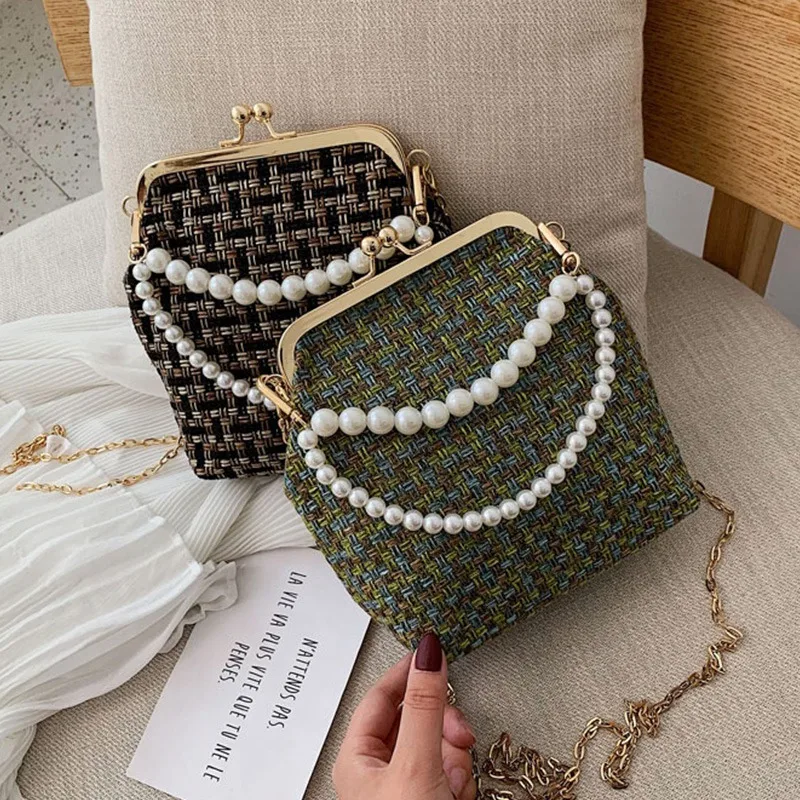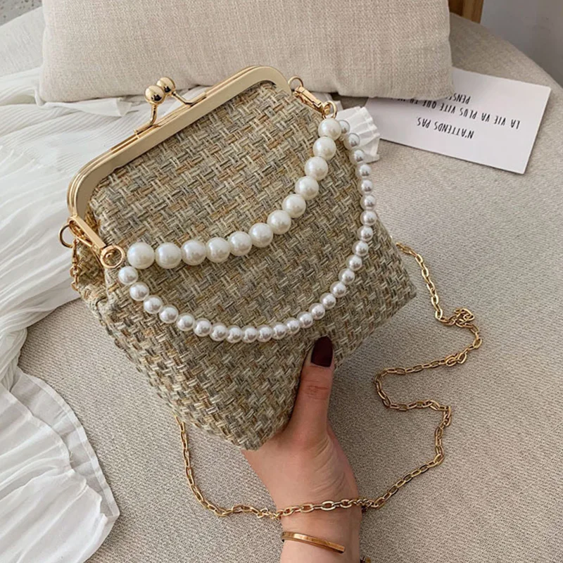 New Straw Small Bag Pearl Chain Messenger Bag Female Wild Single Shoulder Shell Bag
